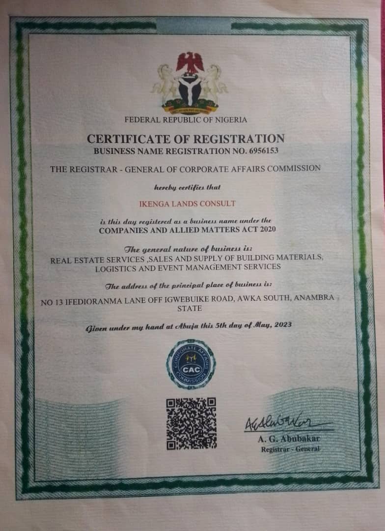 This certificate confirms that IKENGA LANDS CONSULT operates in full compliance with Nigeria's business regulations and maintains all legal standards required for corporate existence.